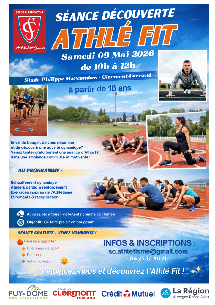 Le Stade Clermontois Athlétisme invite le grand public à venir découvrir une activité sportive dynamique et conviviale à l’occasion d’une séance gratuite d’Athlé Fit, organisée le samedi 9 mai 2026, de 10h à 12h, au stade Philippe Marcombes à Clermont-Ferrand.
